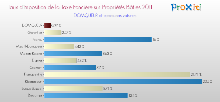 A noter : la valeur moyenne de ce taux de taxe foncière sur le bâti dans les communes françaises similaires à Domqueur était de 11.86 %, en 2011.