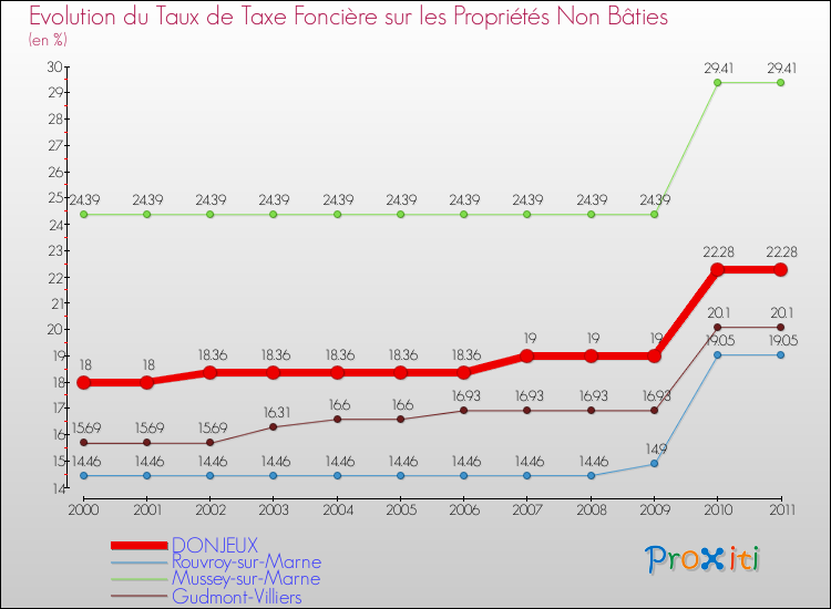 A Donjeux, le taux de taxe foncière sur le non bâti a donc augmenté de 23.78 % entre 2000 et 2011.
