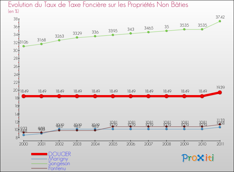 A Doucier, le taux de taxe foncière sur le non bâti a donc augmenté de 4.87 % entre 2000 et 2011.