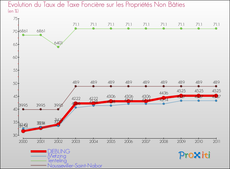 A Diebling, le taux de taxe foncière sur le non bâti a donc augmenté de 43.47 % entre 2000 et 2011.