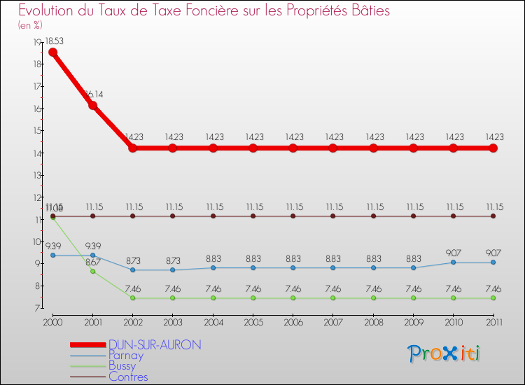 Pendant la même période, les communes françaises similaires à Dun-sur-Auron, ont vu leur taux de taxe foncière sur le bâti augmenter de 7.3 % en moyenne entre 2000 et 2011.