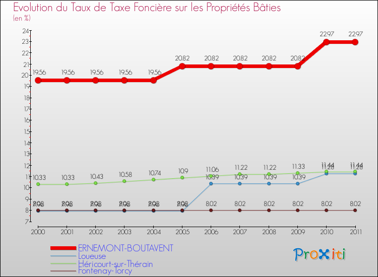 Pendant la même période, les communes françaises similaires à Ernemont-Boutavent, ont vu leur taux de taxe foncière sur le bâti augmenter de 7.9 % en moyenne entre 2000 et 2011.