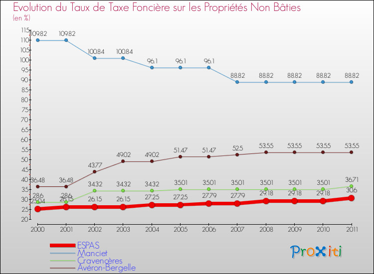 Pendant la même période, les communes françaises similaires à Espas, ont vu leur taux de taxe foncière sur le non bâti augmenter de 2.96 % en moyenne entre 2000 et 2011.