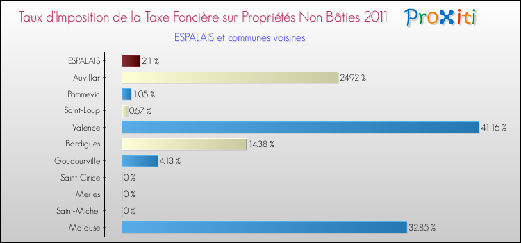 Vous trouverez ci-dessous des graphiques qui vous permettent de situer le taux de la taxe foncière sur le non bâti de Espalais par rapport aux communes voisines.