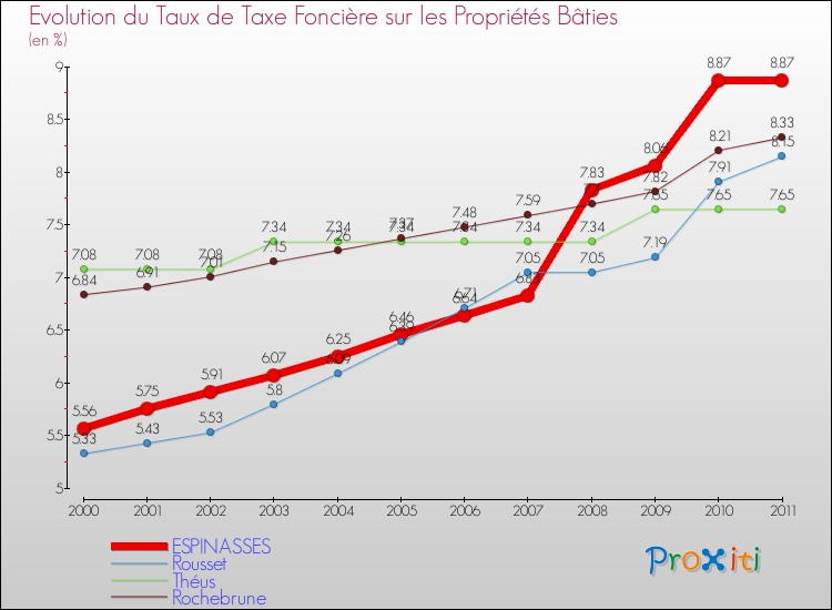 A Espinasses, le taux de taxe foncière sur le bâti a donc augmenté de 59.53 % entre 2000 et 2011.
