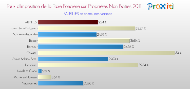 Vous trouverez ci-dessous des graphiques qui vous permettent de situer le taux de la taxe foncière sur le non bâti de Faurilles par rapport aux communes voisines.