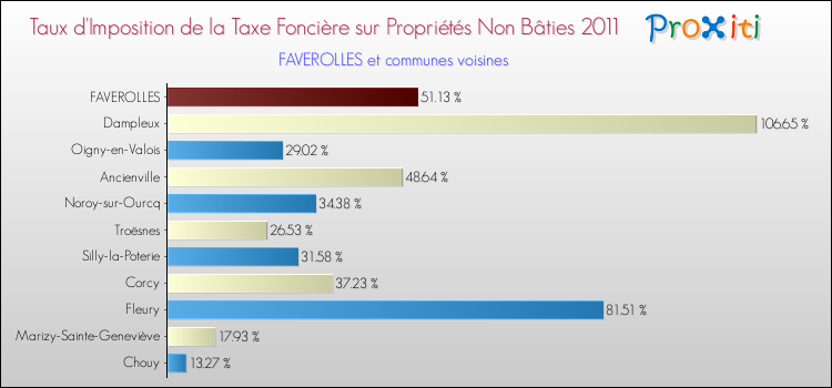 Vous trouverez ci-dessous des graphiques qui vous permettent de situer le taux de la taxe foncière sur le non bâti de Faverolles par rapport aux communes voisines.