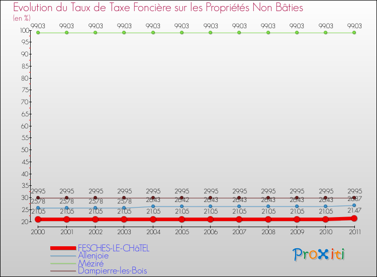 Pendant la même période, les communes françaises similaires à Fesches-le-Châtel, ont vu leur taux de taxe foncière sur le non bâti augmenter de 12.1 % en moyenne entre 2000 et 2011.