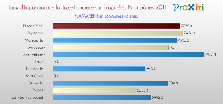 En 2011, le taux de la taxe foncière sur le non bâti vôté par le conseil municipal de Flamarens était de : 77.79 %.