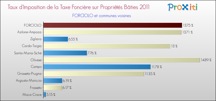 En 2011, le taux de la taxe foncière sur le bâti vôté par le conseil municipal de Forciolo était de : 13.75 %.
