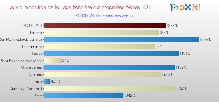 A noter : la valeur moyenne de ce taux de taxe foncière sur le bâti dans les communes françaises similaires à Froidfond était de 15.82 %, en 2011.