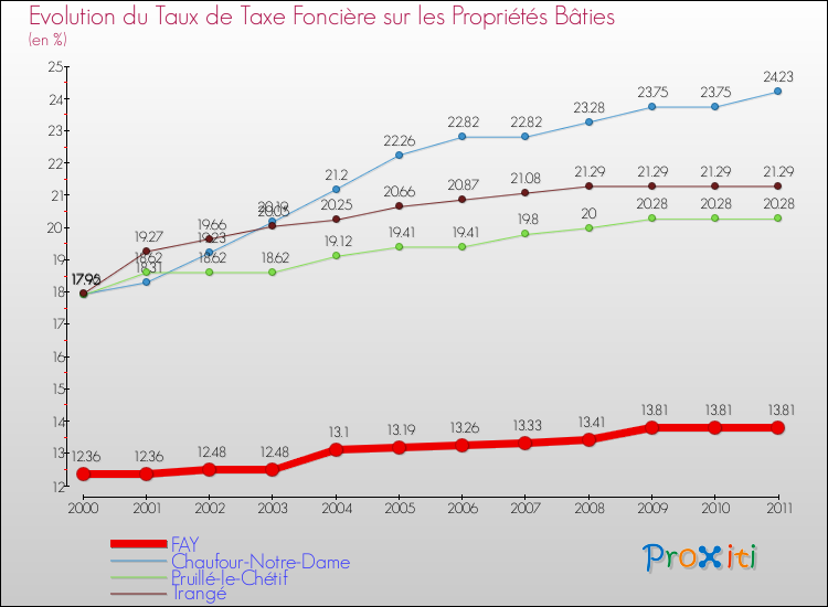 A Fay, le taux de taxe foncière sur le bâti a donc augmenté de 11.73 % entre 2000 et 2011.