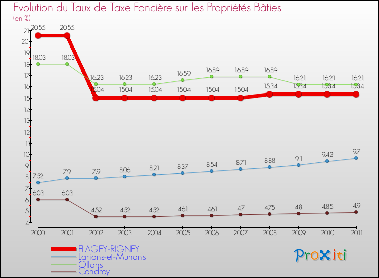 A Flagey-Rigney, le taux de taxe foncière sur le bâti a donc baissé de 25.35 % entre 2000 et 2011.