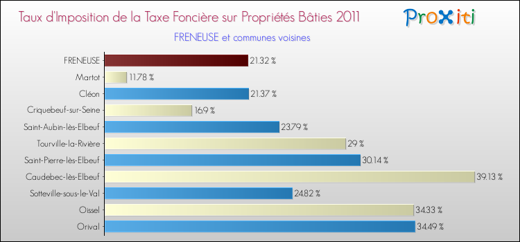 En 2011, le taux de la taxe foncière sur le bâti vôté par le conseil municipal de Freneuse était de : 21.32 %.