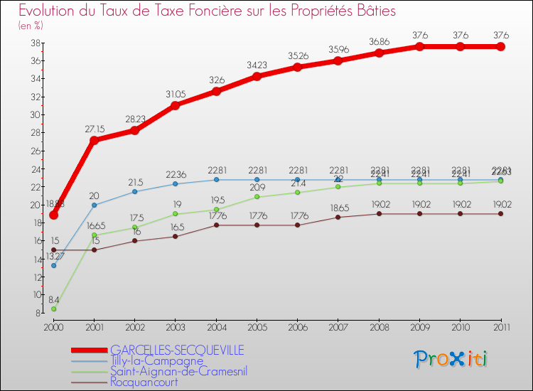 Pendant la même période, les communes françaises similaires à Garcelles-Secqueville, ont vu leur taux de taxe foncière sur le bâti augmenter de 23.3 % en moyenne entre 2000 et 2011.