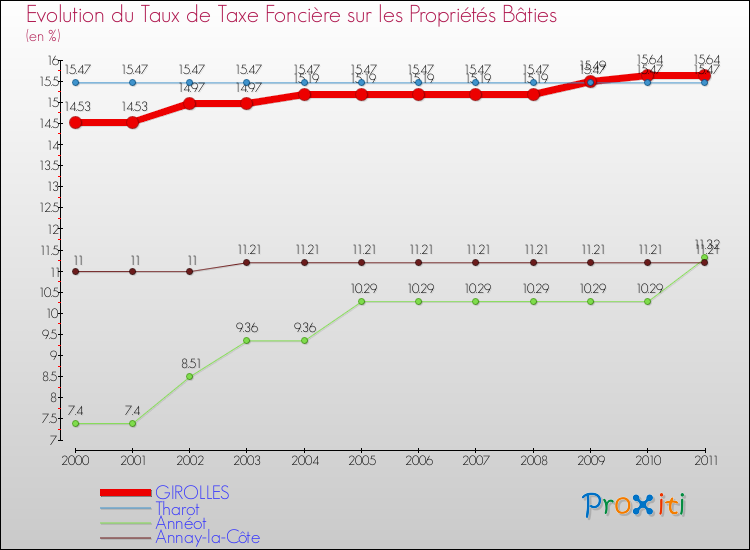 A Girolles, le taux de taxe foncière sur le bâti a donc augmenté de 7.64 % entre 2000 et 2011.