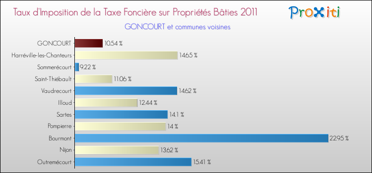 En 2011, le taux de la taxe foncière sur le bâti vôté par le conseil municipal de Goncourt était de : 10.54 %.