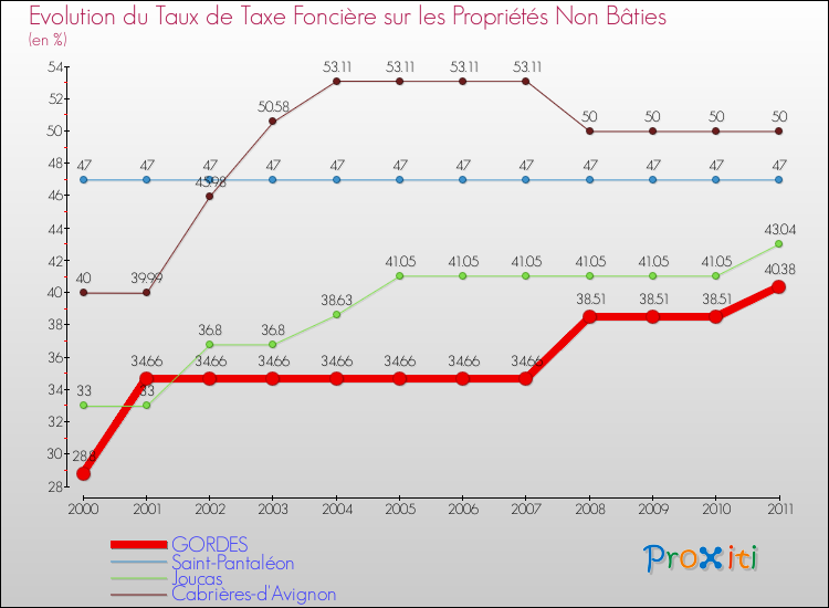A Gordes, le taux de taxe foncière sur le non bâti a donc augmenté de 40.21 % entre 2000 et 2011.