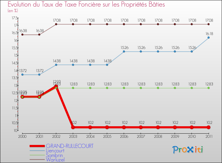 A Grand-Rullecourt, le taux de taxe foncière sur le bâti a donc baissé de 16.73 % entre 2000 et 2011.