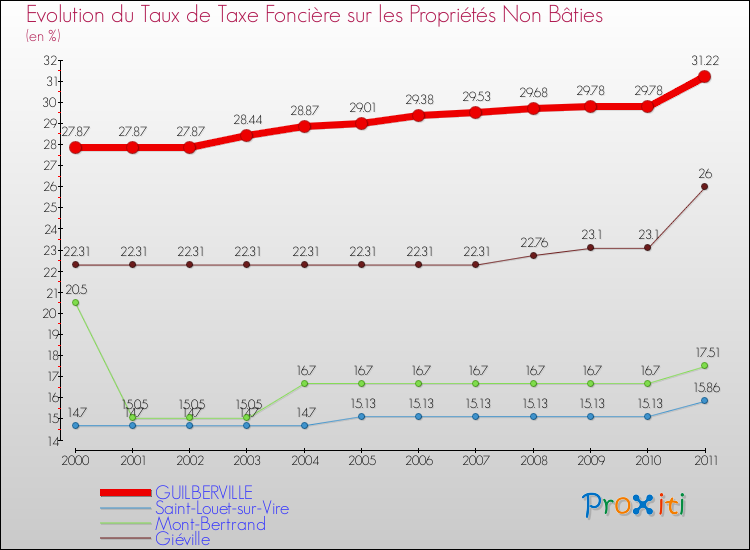 Pendant la même période, les communes françaises similaires à Guilberville, ont vu leur taux de taxe foncière sur le non bâti augmenter de 9.13 % en moyenne entre 2000 et 2011.