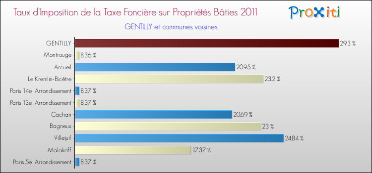 Pendant la même période, les communes françaises similaires à Gentilly, ont vu leur taux de taxe foncière sur le bâti augmenter de 6.02 % en moyenne entre 2000 et 2011.
