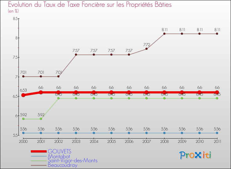 A Gouvets, le taux de taxe foncière sur le bâti a donc augmenté de 1.07 % entre 2000 et 2011.