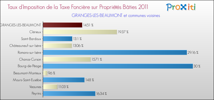 A noter : la valeur moyenne de ce taux de taxe foncière sur le bâti dans les communes françaises similaires à Granges-les-Beaumont était de 15.82 %, en 2011.