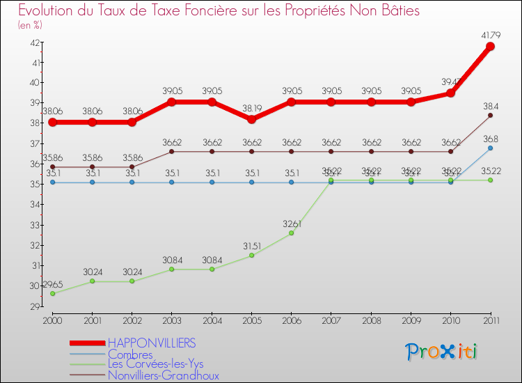 A Happonvilliers, le taux de taxe foncière sur le non bâti a donc augmenté de 9.8 % entre 2000 et 2011.