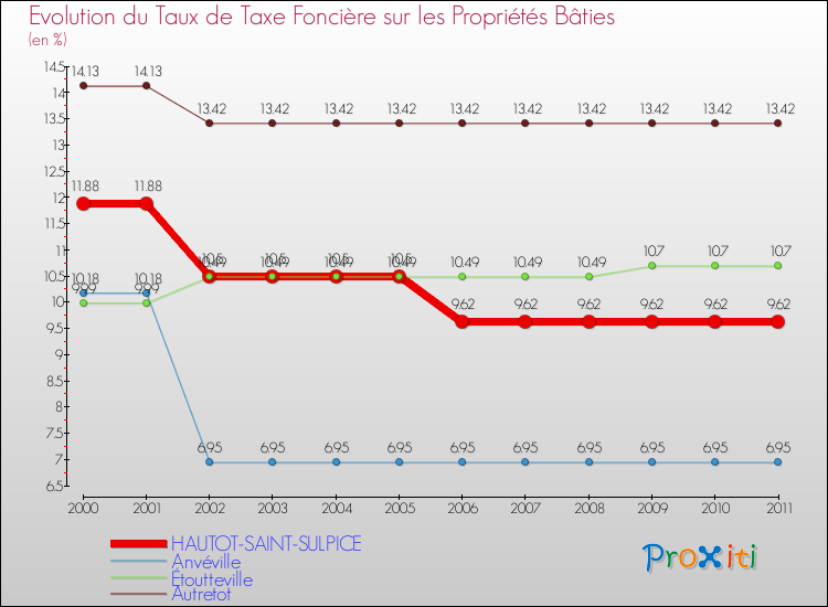 A Hautot-Saint-Sulpice, le taux de taxe foncière sur le bâti a donc baissé de 19.02 % entre 2000 et 2011.