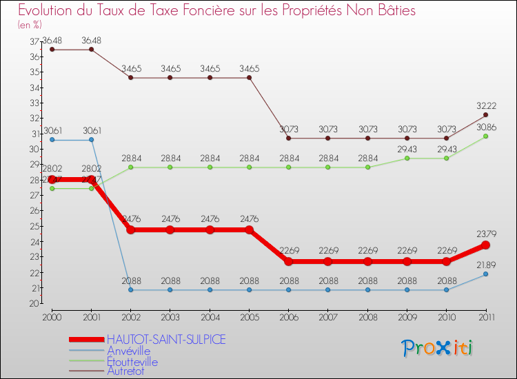 A Hautot-Saint-Sulpice, le taux de taxe foncière sur le non bâti a donc baissé de 15.1 % entre 2000 et 2011.