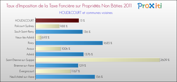 En 2011, le taux de la taxe foncière sur le non bâti vôté par le conseil municipal de Houdilcourt était de : 13 %.