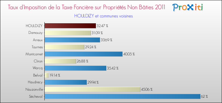 En 2011, le taux de la taxe foncière sur le non bâti vôté par le conseil municipal de Houldizy était de : 32.47 %.