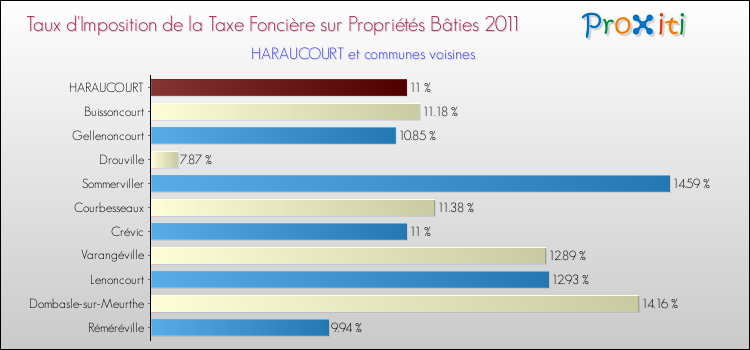 En 2011, le taux de la taxe foncière sur le bâti vôté par le conseil municipal de Haraucourt était de : 11 %.