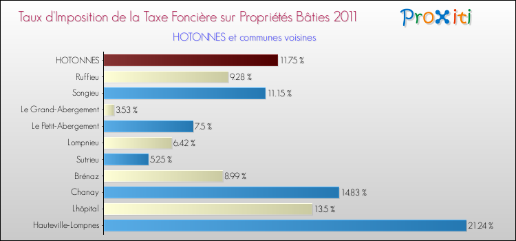 En 2011, le taux de la taxe foncière sur le bâti vôté par le conseil municipal de Hotonnes était de : 11.75 %.