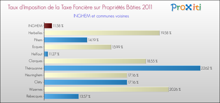 En 2011, le taux de la taxe foncière sur le bâti vôté par le conseil municipal de Inghem était de : 11.58 %.