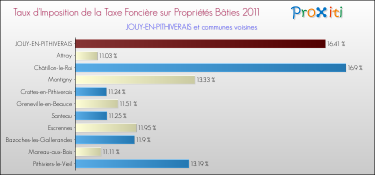 En 2011, le taux de la taxe foncière sur le bâti vôté par le conseil municipal de Jouy-en-Pithiverais était de : 16.41 %.