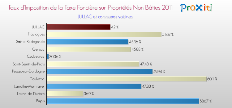 En 2011, le taux de la taxe foncière sur le non bâti vôté par le conseil municipal de Juillac était de : 42 %.
