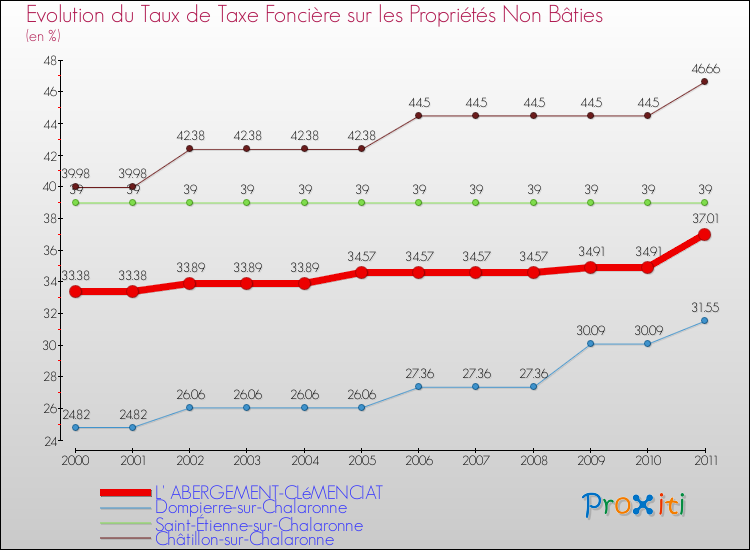 Pendant la même période, les communes françaises similaires à L' Abergement-Clémenciat, ont vu leur taux de taxe foncière sur le non bâti baisser de 1.22 % en moyenne entre 2000 et 2011.