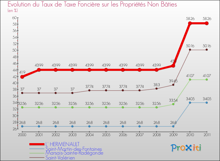 Pendant la même période, les communes françaises similaires à L' Hermenault, ont vu leur taux de taxe foncière sur le non bâti augmenter de 27.19 % en moyenne entre 2000 et 2011.