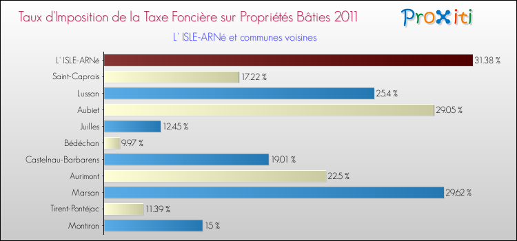En 2011, le taux de la taxe foncière sur le bâti vôté par le conseil municipal de L' Isle-Arné était de : 31.38 %.