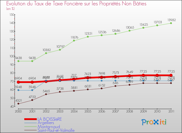 A La Boissière, le taux de taxe foncière sur le non bâti a donc augmenté de 11.89 % entre 2000 et 2011.
