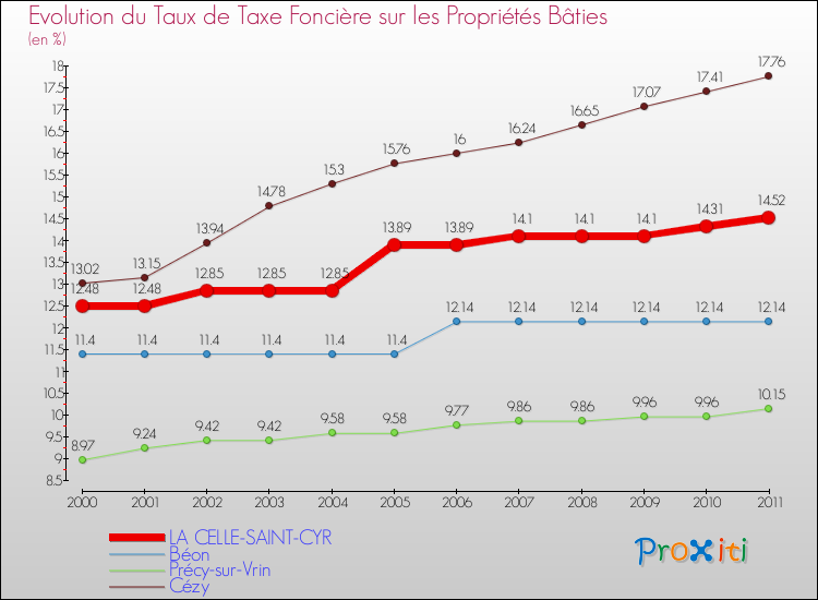 En 2011, le taux de la taxe foncière sur le bâti vôté par le conseil municipal de La Celle-Saint-Cyr était de : 14.52 %.
