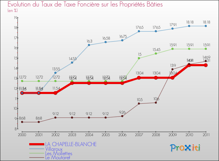 Pendant la même période, les communes françaises similaires à La Chapelle-Blanche, ont vu leur taux de taxe foncière sur le bâti augmenter de 23.8 % en moyenne entre 2000 et 2011.