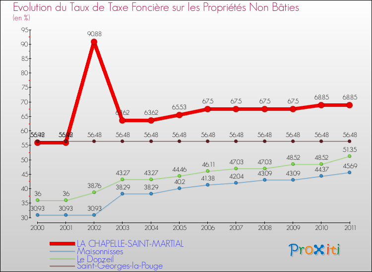 Pendant la même période, les communes françaises similaires à La Chapelle-Saint-Martial, ont vu leur taux de taxe foncière sur le non bâti augmenter de 49.83 % en moyenne entre 2000 et 2011.