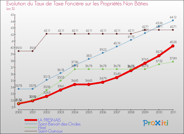 Pendant la même période, les communes françaises similaires à La Fresnais, ont vu leur taux de taxe foncière sur le non bâti augmenter de 29.17 % en moyenne entre 2000 et 2011.