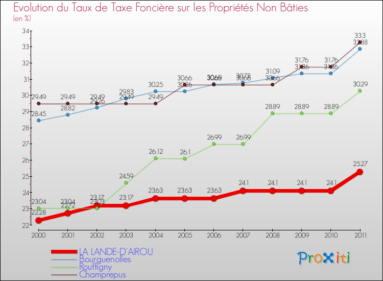 Pendant la même période, les communes françaises similaires à La Lande-d'Airou, ont vu leur taux de taxe foncière sur le non bâti augmenter de 14.55 % en moyenne entre 2000 et 2011.
