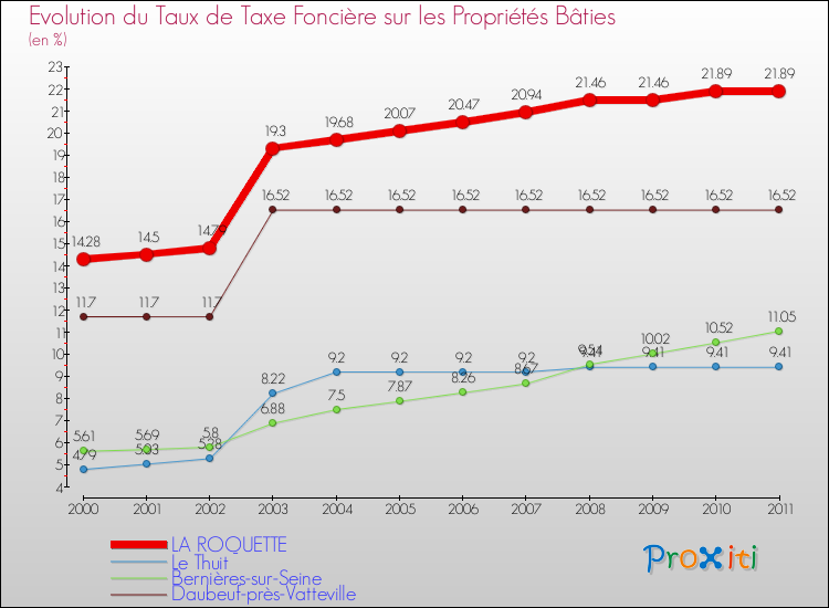 Pendant la même période, les communes françaises similaires à La Roquette, ont vu leur taux de taxe foncière sur le bâti augmenter de 22.88 % en moyenne entre 2000 et 2011.
