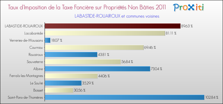 En 2011, le taux de la taxe foncière sur le non bâti vôté par le conseil municipal de Labastide-Rouairoux était de : 89.63 %.