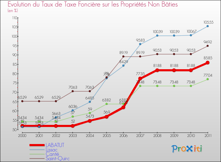 A Labatut, le taux de taxe foncière sur le non bâti a donc augmenté de 65.1 % entre 2000 et 2011.