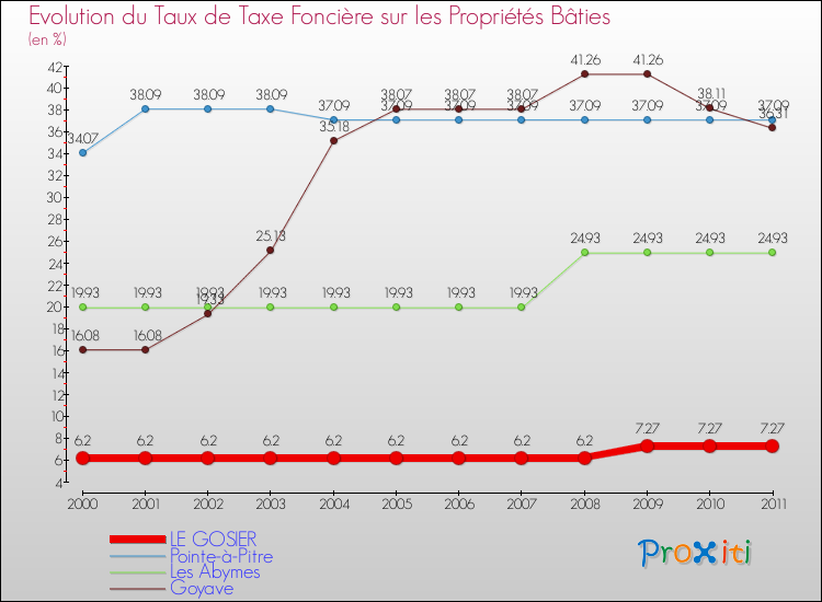 A Le Gosier, le taux de taxe foncière sur le bâti a donc augmenté de 17.26 % entre 2000 et 2011.